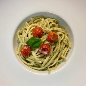 Pasta con salsa pesto casera a base de albahaca, parmesano, aceite de oliva y frutos secos